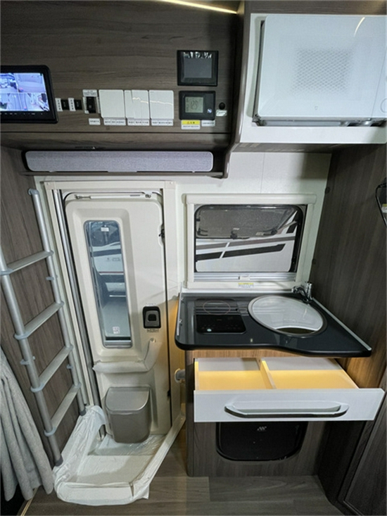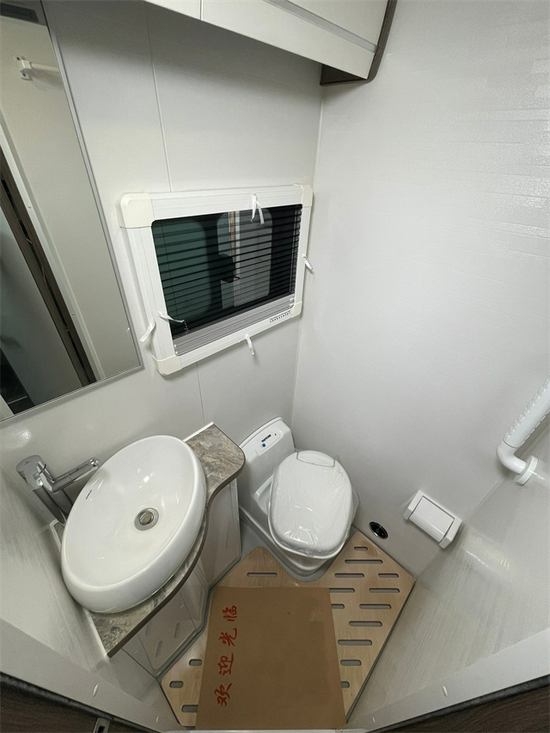 走进车内,驾驶舱中控台、扶手、方向盘桃木装饰,细节精致,与后舱设计相匹配;整车E0级进口轻量化定制内饰板,轻便防潮。整车前左侧为4人卡座沙发、右侧为厨房区域、中部为卫生间,尾部为横置双人床铺,布局人性合理,非常符合国人生活习惯!整车配备前后舱隔帘+额头床帘+后拓展舱隔帘,真空双层亚克力外推窗(带防蚊帘和日夜帘)。