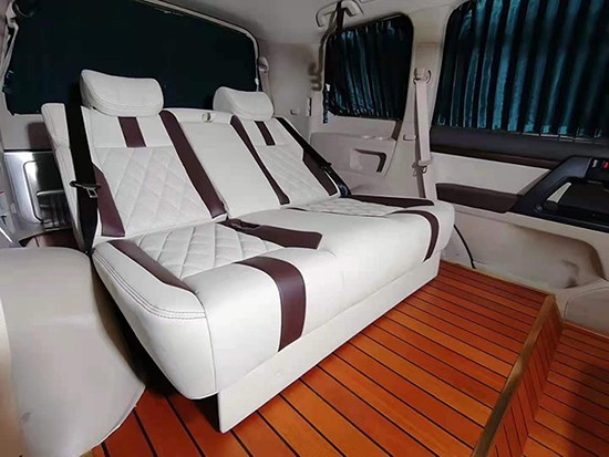 沙发床可以提供三人一起坐,但和原车的一样,三人坐一起会不舒服,两人坐是最好的,腿部空间非常宽阔,一米九的身材在后排腿也能伸展开来,靠背还可以往后180°平躺着,另外座椅也带有前后移动功能,大概前后能移动24公分。