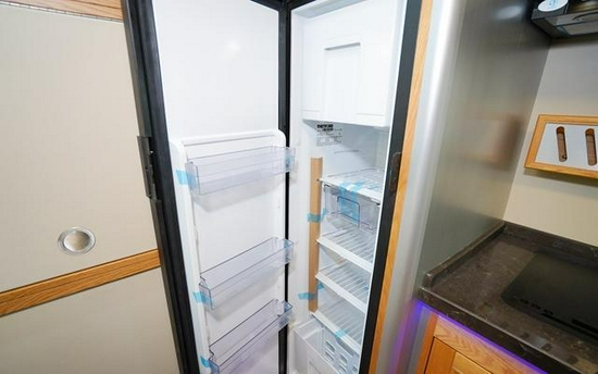 厨房配有156升进口赛特福德房车专用冰箱,无论是在沙漠地带还是鸟无人烟的无人区,都可以喝到冰凉爽口的冰水。德国品牌嵌入式微波炉,可进行食物简单加热,无论身处何处都不会让您饿肚子。