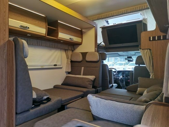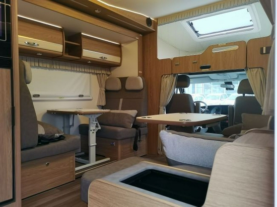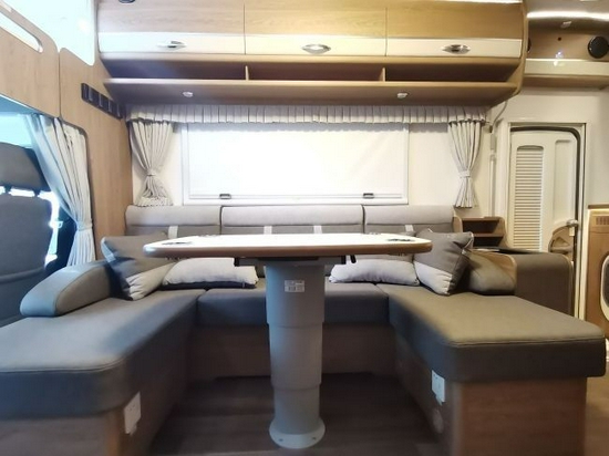 大量的浅色木纹家具,搭配米色的沙发座椅,整车格调温馨自在。和常见的依维柯C型房车不同,在内部布局方面大胆创新,前部车厢左右两侧各布置沙发座椅,并且都有着升降桌。
