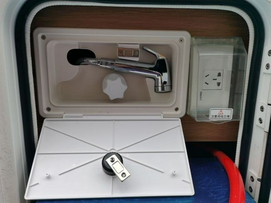 车身外部功能设施完善,设有上车踏步、遮阳棚、室外照明灯、拓展舱遮阳棚、注水口、电源插座、外置淋浴、抽拉式户外灶等设施,给出行提供更舒适的户外体验。