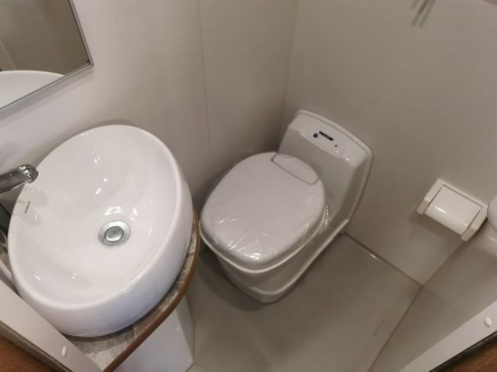 淋浴间内部的配置也是非常齐全的,马桶、洗手台、淋浴系统、储物柜以及上方换气扇都有配备,整车的净水箱容量为180L,灰水箱为45L,满足我们日常的使用。