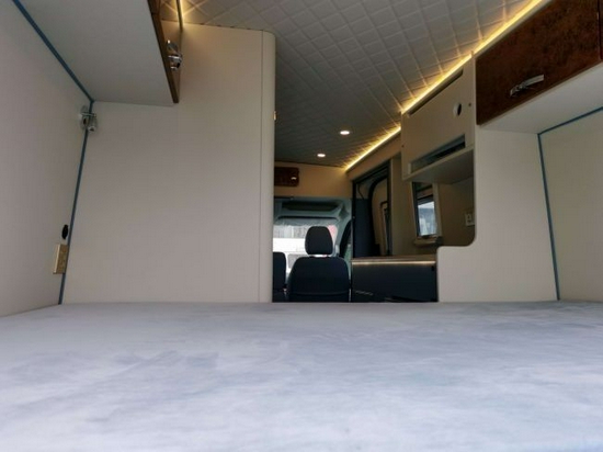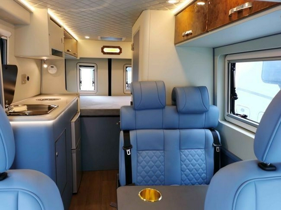 单从外观看去,B型房车就和我们常见的V90轻客一样。该车采用了顶的设计,外观长度5.94米,宽度2.1米,高度2.55米,轴距3.76米,可以悬挂蓝牌在城市内行驶。