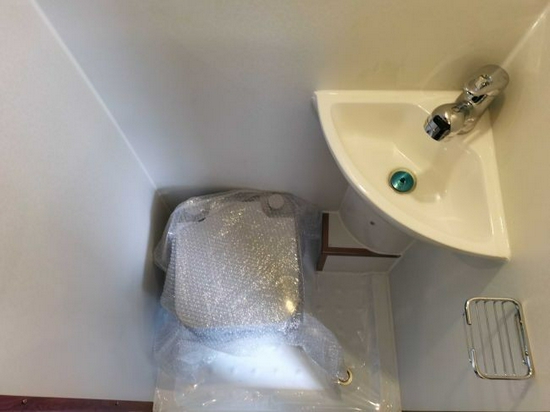厨房对面是一体式卫浴间。标配双向换气扇,照明灯,浴室镜,独立洗手池,淋浴系统和盒式便携式马桶,满足应急如厕和淋浴要求。