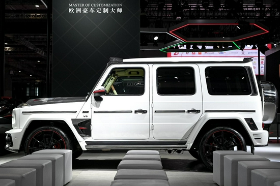 不论是迈莎锐G63 还是G63 P720,外观皆沿袭了G-Class (配置|询价)永恒经典的四方盒子造型。其中象牙白漆底的迈莎锐G63,车身大面积覆盖由MANSORY自家热压工艺打造而成的黑线碳纤维空气动力学组件,让全车显现出动感立体,层次分明的视觉效果。