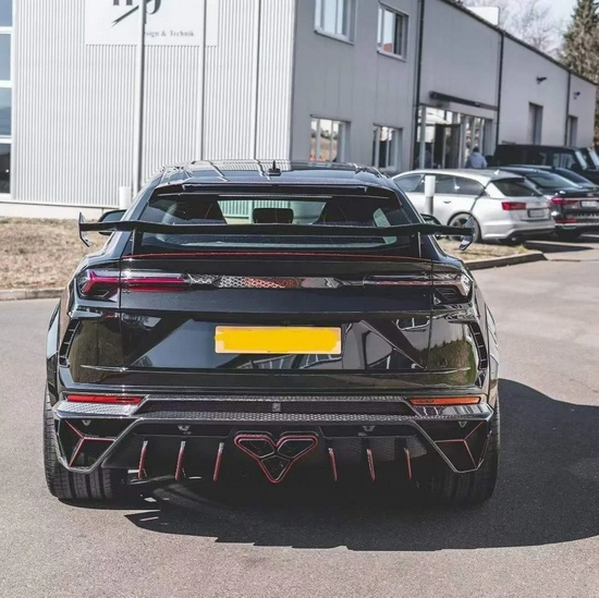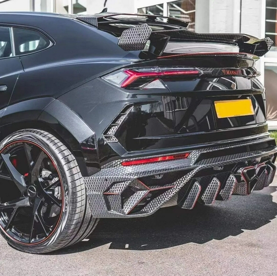 车尾部分,MANSORY迈莎锐为Urus增加了碳纤维材质的后保险杠、尾翼、后备箱盖扰流、后置扩散器、星状三出排气管、车尾左右侧扰流片以及连接左右尾灯带有MANSORYlogo的碳纤维饰条等......形成了极具冲击力的视觉效果。