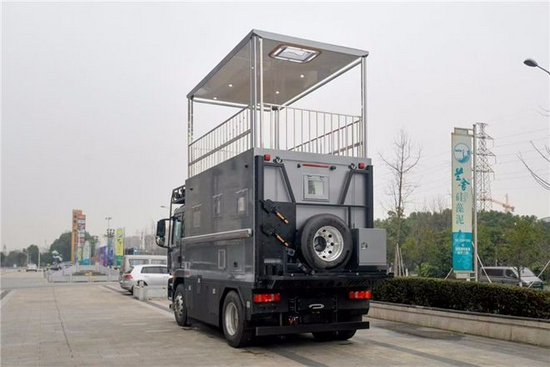 越野专用方舱造型,三点悬浮设计,保证车厢稳定性的同时也防止意外变形,地板及家具异响,极大延长箱体使用寿命。底盘方面,前后悬挂采用前后专用板簧+液压筒式减震器的组合形式,其作用可过滤行驶途中的颠簸感也保证了舒适性;三把差速锁也让它对于任何路况都可从容不迫的通过,提升了户外越野的生存性。轮胎规格为425/65 R22.5。 尾部18500T-MAX 24伏电动绞盘,备胎电动挂在系统,加挂两个外部储物盒。