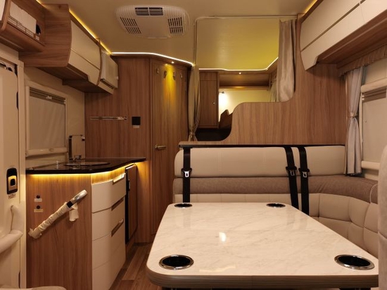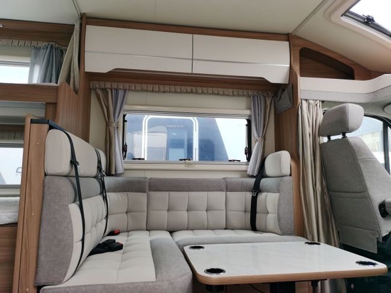 驾驶室后方是全车的会客区,采用的是L型沙发+单人座椅的布局方式,其中L型沙发提供了四条安全带,行车时可以乘坐,加上驾驶室两个座椅整车核载6人,沙发座椅的材质乘坐起来比较亲肤,整体的舒适性也不错。