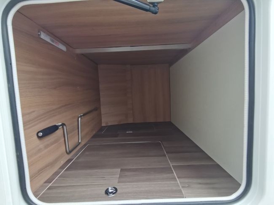 车厢尾部是全车的休息区和卫浴室,休息区采用的是上下双层子母床的设计,上层床尺寸约为1900*750mm,可以睡下一名成年人;下层床是双人床,尺寸约为1900mm*1150mm,可以容纳2名成年人,如果不使用上层床铺,也可以将它折叠起来,提升下层双人床的空间。