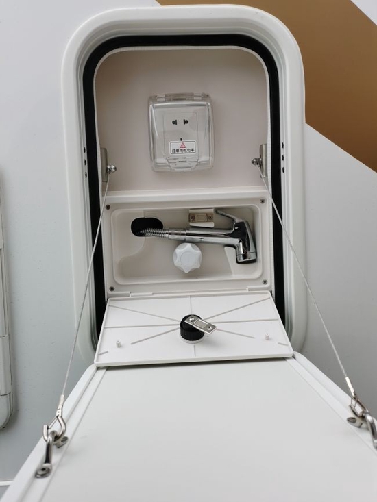 车中门旁侧配置有多个储物仓,除此之外,车身侧面还配置有抽拉炉灶、外置淋浴、外置桌板、燃气罐舱、外置遮阳棚等,能够满足丰富的露营需求。