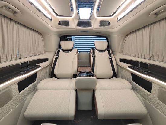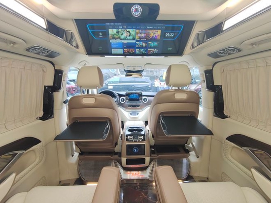这台新款奔驰v260商务车通过巧妙的空间优化,达到非凡的车内休闲娱乐享受;要是在车内开个临时会议,调整座椅,放置桌板,轻松搞定会议室。