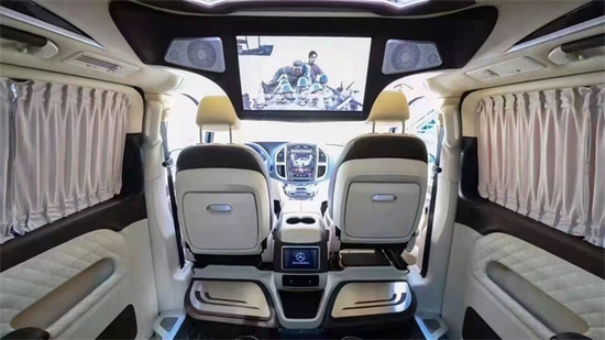 这款即是奔驰授权主机厂出品的高迪双开门威霆,整个内饰用的是浅色系的搭配,相对于原裸车,也是有了一个天翻地覆的变化。就整个内饰配置而言,大屏的导航中控;半隔断的电视机配备柏林之声的音响;靠背小桌板的日常商务办公功能;以及休息脚踏和中央扶手冰箱;在加上整车的真皮软包和窗户的窗帘;由此可看,整车的实用性,功能性以及豪华性都会有了很大程度的提升。