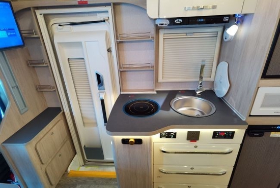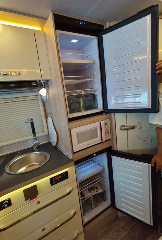 厨房区域,美国科勒高弯水龙头+不锈钢水盆、1200W志高电磁炉、12V的城邦房车专用吸油烟机。靠里面的位置不仅有韩国大宇微波炉,还配有两个独立的76L英得尔房车专用冰箱。此外,电力控制区域也放在厨房区域,升降床操控还配有额外的安全锁和提示,最大程度保证了安全。
