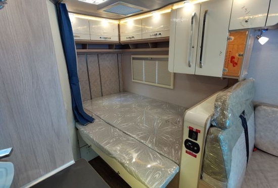 车尾是一张纵置的床位,长度是1米95、宽度1米。周围储物柜都是很居家的设计,但仅仅是张单人床,是肯定不能满足用户需求的。侧面床板是可以拓展的,时不占用太多过道空间,使用的时候还能把尾床宽度拓展到1米33,这在房车里面就算标准的双人床了。床尾有一个透明的小酒柜,衣柜打开,里面还带有自动照明灯。