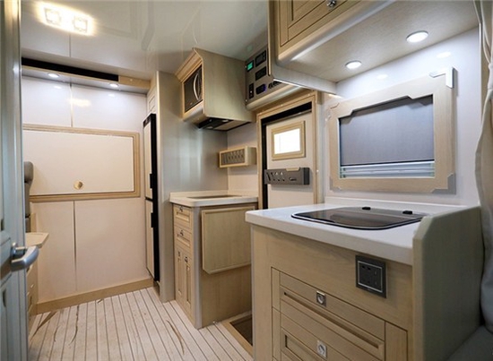 厨房区实木组合式橱柜采用分区域布局设计,由乘客门隔开,不同的功能相互呼应的同时也让做饭井然有序,橱柜推拉式抽屉便于存放日常生活用品及碗具。其它方面配备触摸式集中控制系统+机械式翘板开关、液晶电视、小米盒子、日本YAMAHA八喇叭音响系统(带低音炮)、抽油烟机、微波炉、西门子电磁炉、152L赛特福德房车专用冰箱、大宇3kg洗衣机、特鲁马燃油暖风热水一体机、四路监控、一氧化碳/烟雾报警器等。室内多个220V、12V电源插座及USB充电接口可满足日常充电需求。
