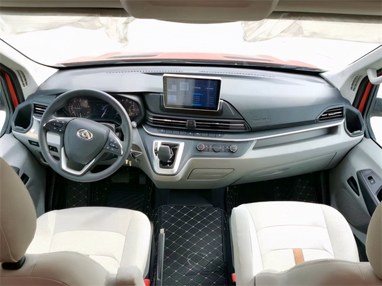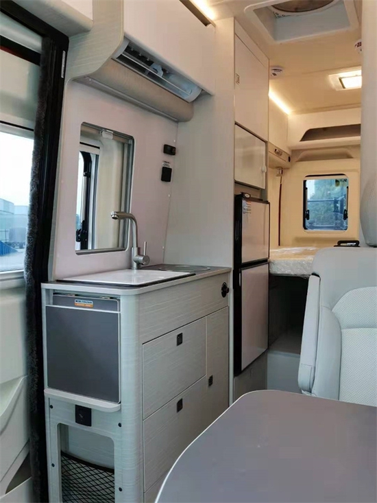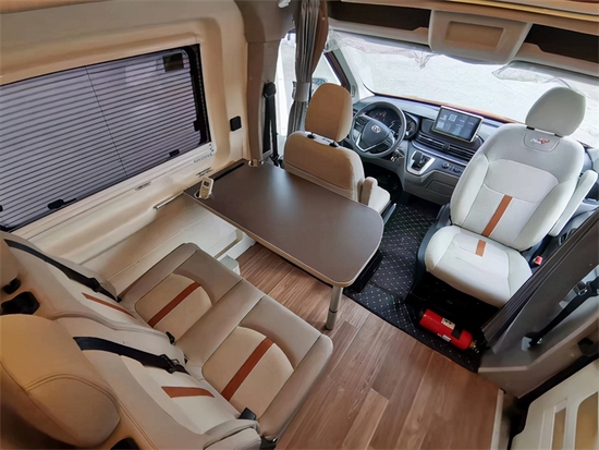 进入内部,明亮活力是带给笔者的最初印象,家具采用乘用车级环保车身内饰。顶部的天窗加上大面积的前挡风玻璃,让内部的透光性非常棒,给人通透明亮之感。中部醒目的暖橙色座椅很适合秋季的氛围。布局分明,前方为驾驶室、会客区,后方为厨房区、卧室区、卫生间。