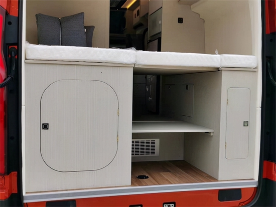 正对乘客门的会客区内提供了两个单人的沙发座椅和一张可移动的升降餐桌,座椅全部采用的是乘用车级别的材质,并配有行车扶手,可以缓解乘车过程中的疲劳感。升降餐桌不仅可以选择在车内就餐、工作使用,也可以移动到车外作为小餐桌使用。另外沙发座椅带有两条安全带,所以整车在行驶过程中最多可以核载4人。