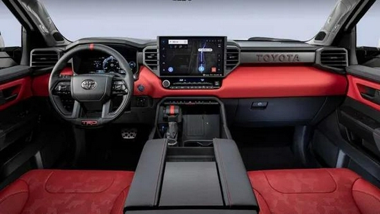 全新2022款坦途TRD Pro采用了全新中控台,一键启动、多功能方向盘、液晶仪表、全景天窗、无线充电等等,最引人注意的是,新车还配备了一块尺寸硕大的多媒体显示屏,这么大尺寸的多媒体显示屏还是首次出现在全尺寸皮卡车上,如果这种大尺寸多媒体显示屏放到国产皮卡里,这种大屏应该会有更多人喜欢。