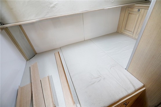 尾部横置上下床很好的利用了该区域的空间,床垫支撑性好,提供了不错的躺感受;上铺翻转式单人床收起后不占用空间,增加了整体区域的活动范围,阅读灯及充电功能也满足日常看书及娱乐需求。床铺下方与尾部储物舱相贯通,取拿物品方便。