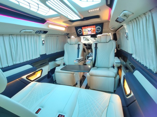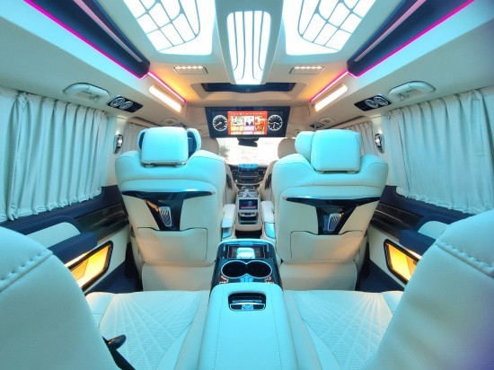 奔驰V260改装迈巴赫VS900商务车内饰的整体设计是婉约柔和的,整个采用米色为主色调,更显淡雅清净内饰也是定制升级过的,显得高端大气。定制风格采用经典的元素,宽大的航空椅配上舒适头枕,坐在上面就想美美睡上一觉。还有柏林之声5.1殿堂级音响环绕系统 独立空调控制开关组合 双电子触控屏,给您舒适与娱乐相结合的享受。