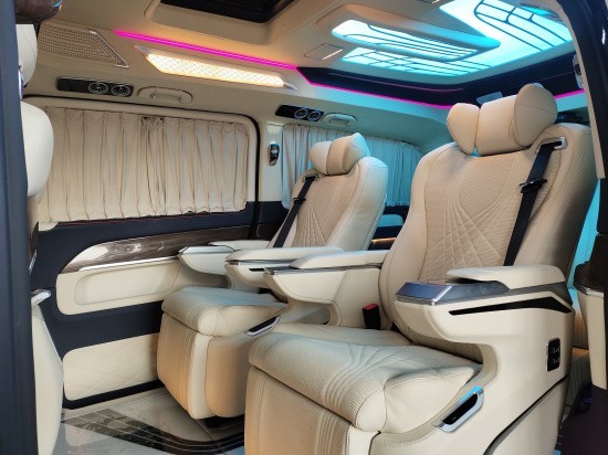 奔驰V260L第三排3人连排沙发,可电动躺成床,中控扶手可放,内置触摸屏即可控制第三排座椅调节。每个座位都配搭安全带保驾护航。奔驰V260L前排座椅为航空机座椅,进口非洲肯尼亚鸵鸟皮背部严格按照人体工程学手工缝制而成,通风、加热、360°旋转、四段八向电动调节,座椅填充非常充足,质感强烈,轻松应对各种路面。