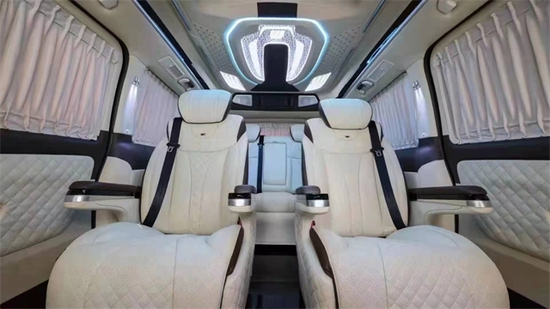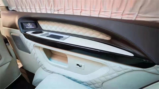 这款即是奔驰授权主机厂出品的高迪双开门威霆,整个内饰用的是浅色系的搭配,相对于原裸车,也是有了一个天翻地覆的变化。就整个内饰配置而言,大屏的导航中控;半隔断的电视机配备柏林之声的音响;靠背小桌板的日常商务办公功能;以及休息脚踏和中央扶手冰箱;在加上整车的真皮软包和窗户的窗帘;由此可看,整车的实用性,功能性以及豪华性都会有了很大程度的提升。