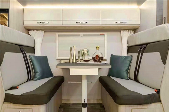 车厢左侧拓展是车上的卡坐沙发区域,标准的四人卡坐沙发,不过由于2020款尊领ST的侧拓展尺寸更大,为此卡坐沙发的尺寸也得到拓展,实际乘坐四人完全不会拥挤,而尺寸加大的另一个好处就是当变成沙发床的时候,尺寸为1900*900mm。