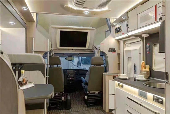 进入车厢内部,得益于车厢左侧和后部的两个拓展舱,可以感受到车内空间非常之大,车内浅色家具以及大量氛围灯的加入,也把生活区的氛围烘托地恰到好处,同时家具、座椅的质感相当出色,相信对于那些比较挑剔的用户来说,还是很容易接受的。