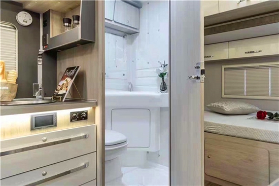 卫生间整体一体式航空材料,带木质纹理,简约时尚大气奢华 。卫生间配备赛特福德旋转式坐便器,18L黑水箱,一体洗手池。整车采用伟巴思特热水暖风一体机系统。净水箱180L,灰水箱40L。