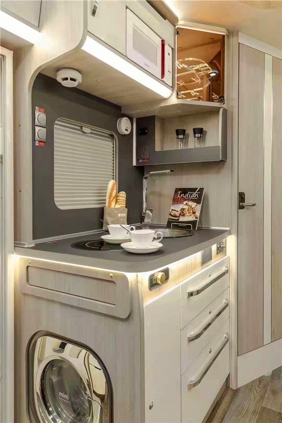 厨房区配备电磁炉、带盖板的洗菜池、油烟很及微波炉,橱柜及洗衣机,透明酒柜,商务风尽显,赛特福德152L车载冰箱。依维柯尊领ST采用德进口REICH水而管件系统,带前置看滤器和美国进口赛福乐水泵。