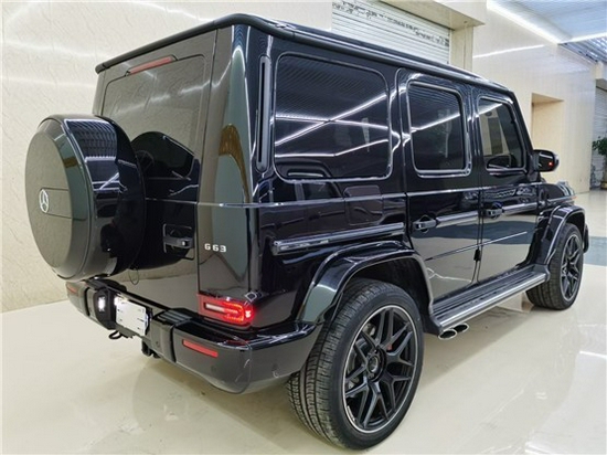 21款奔驰G63侧面还是方方正正的,车身线条十分硬朗,配备了踏板,为上下车提供了方便,还有双边双出的侧排气,非常的有越野味儿,底部配备22寸双五幅AMG熏黑轮毂,不仅霸气而且运动感十足。