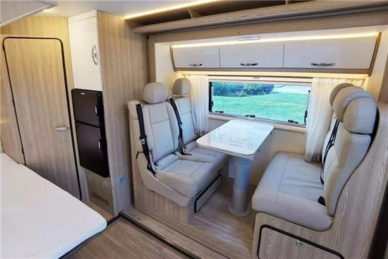 会客区四座座椅采用对坐式设计,使用奔驰V-CLASS (配置|询价)原厂座椅,宽敞舒适。车内配备进口壁挂型餐桌、左侧顶部吊装组合储物柜、氛围灯、顶部LED照明灯等。外推窗和纱窗,保护隐私的同时带来足够的采光及空气流通。