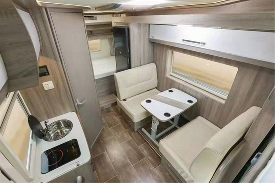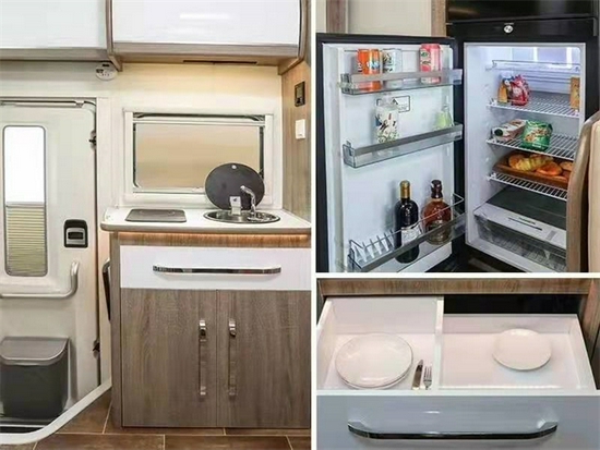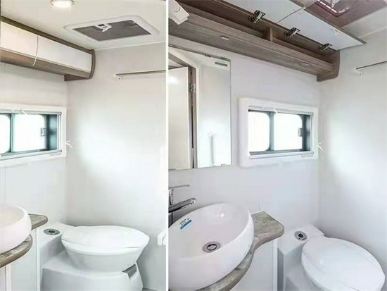 厨房区域的收纳柜和电器都配备完善,小米电磁炉、冷热水盖板水槽、进口多美达224L双开门冰箱自不必说,除此之外还配有一氧化碳、可燃气体探测器,厨房安全不必担忧。卫生间由SMC复合航空材料打造,整体式卫浴耐水防霉,内部的赛特福德可旋转式盒式马桶、洗手池、花洒、排气扇、透气窗、储物柜等一应俱全。水路配置上,净水箱为180L,灰水箱为45L手自双排。