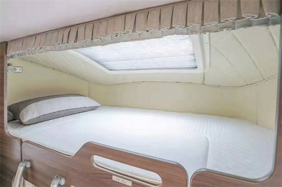 额头采用中额头设计整个空间进行了真皮的软包中间一面弧形的大天窗保证我们在额头区域的一个通风效果保证了在额头区域的睡眠效果。尺寸为2100×1200(mm),可通过室内爬梯上下便捷,能满足两名成年人休息;