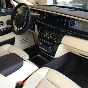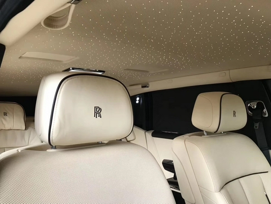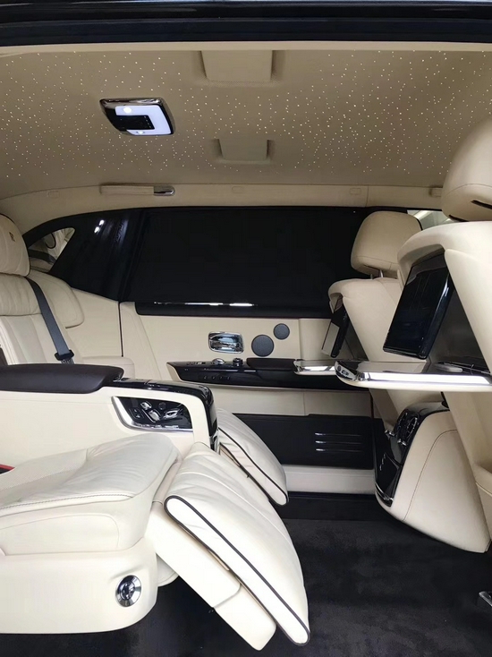 劳斯莱斯幻影电动折叠板和后排影院系统被巧妙的隐藏在前排座椅的椅背后,只需轻触按钮,便可以自如收放桌板和影院系统,带来完美的剧院体验。后排中央固定扶手做了重点优化,其中国可容纳带有威士忌酒具的酒柜、香槟酒具和冷藏箱,方便乘客畅快交谈,后排座椅角度可以任意调节,这一设计让客户无需转头便可视线自如交流。整个车厢内饰全部以最精美的高档材料装饰,使车内极具触感。