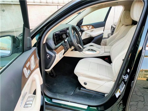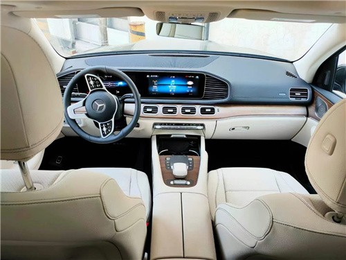奔驰GLS450内饰方面,则延续了现款S级 (配置|询价)的,用的是贯穿式中控台双屏设计,12.3英寸的双液晶显示屏带来的科技感爆强,并且搭载了奔驰最新的MBUX人机交互系统,采用搪塑, 皮革,实木,金属和碳纤维材质,三幅式平底方向盘动感十足。