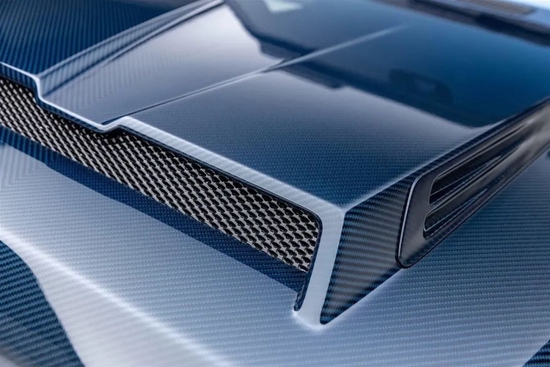 车头最惹眼的部位莫过于全碳打造的引擎机盖:T200黑线碳纤维与周遭“中国蓝”涂装看似格格不入,实则展现出一种丰富的立体层次感和凌厉的热血战地气,仿佛一位身着黑甲的将军般肃杀凛然,持续释放着令观者心生敬畏的轩昂器宇。除了观感出众,被誉为材料界“黑色黄金”的碳纤维具有的:轻量、坚固、耐磨损、抗拉伸、耐高温等诸多优良属性,在有效减轻车身自重提高燃油利用率的同时,还能极大提升前擎散热能力。