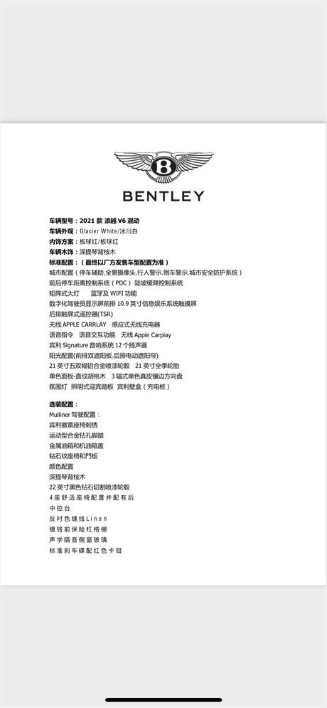 21款宾利添越混动四座 338万增值