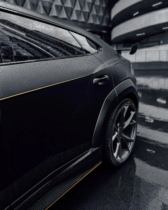 放大细节,可以清楚地看到这头哑光黑“野牛”车头不论:引擎盖、前唇、前保、进气口格栅、出气口饰件等部位都被MANSORY有针对性地添加了大面积飞机纹锻造碳,并辅以兰博基尼经典家族黄装饰线对宽体套件外沿进行勾勒点缀,使Urus前脸呈现出前所未有的丰富层次感和魂动跃然的未来科技氛围。