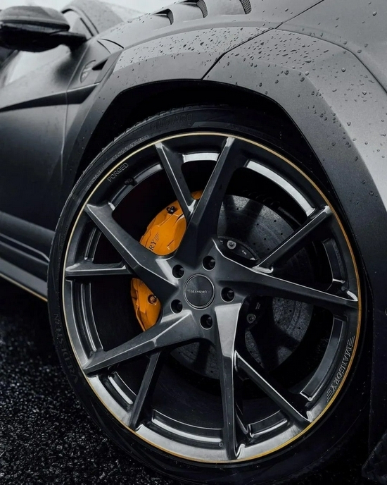 MANSORY为Urus单独定制了24寸5幅全锻轮毂,搭配前:295/30 R24 ,后:355/25R24高性能轮胎以及隐于轮毂后方的炫黄色刹车卡钳,将超跑独有的热血赛道氛围映衬得淋漓尽致,蓦然回首间,心跳加速时~