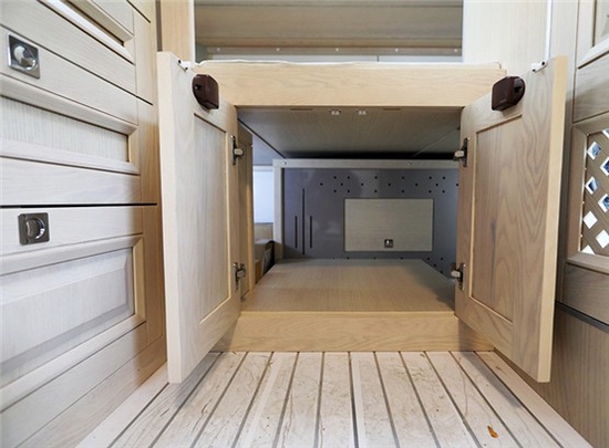 厨房区实木组合式橱柜采用分区域布局设计,由乘客门隔开,不同的功能相互呼应的同时也让做饭井然有序,橱柜推拉式抽屉便于存放日常生活用品及碗具。其它方面配备触摸式集中控制系统+机械式翘板开关、液晶电视、小米盒子、日本YAMAHA八喇叭音响系统(带低音炮)、抽油烟机、微波炉、西门子电磁炉、152L赛特福德房车专用冰箱、大宇3kg洗衣机、特鲁马燃油暖风热水一体机、四路监控、一氧化碳/烟雾报警器等。室内多个220V、12V电源插座及USB充电接口可满足日常充电需求。