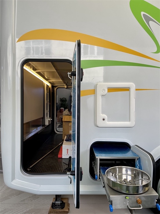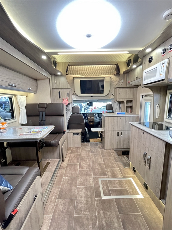 会客区域采用真皮包覆工艺配上卡座式座椅布局,并且配备延伸板可以满足六人同时用餐,而且会客区域顶部设有四个吊柜以及座椅下方的空间和尾部惯穿式的储物舱能为我们提供2500L的储物空间;厨房区配有带盖水槽以及内外一体的抽屉保障我们的烹饪需求,电磁炉配备的是便携式的,除了方便之外也不影响厨房区的美观性,并且损坏之后直接换新的就好,固定的话损坏了不一定好更换。