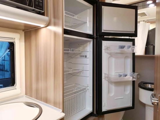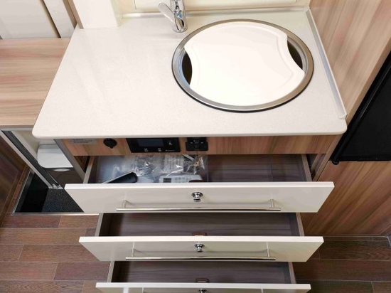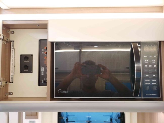 车内厨房,面积不大但配置也做到了高规格,抽油烟机、微波炉车载冰箱和带盖洗菜盆等一步到位,静等各位主厨现场烹饪美味佳肴。