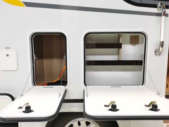 车身右侧,左到右看,依次为黑水箱开设口、快接水口、燃气舱、外置厨房区,车厢侧裙为扁平的储物舱。新车外部厨台也进行了革新,采用了翻板式支撑灶台设计,增加了燃气罐储物舱、厨具储物舱,燃气罐储物舱可以容纳容积为5kg的燃气罐,燃气罐舱角落里开设有溢流口,储物舱与车内空间完全密封,避免了燃气泄漏渗入车内的隐患。