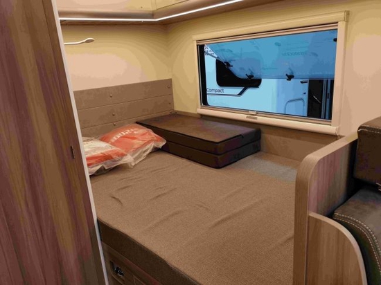 休息区床铺为纵置双人床,长宽尺寸为1900×1300(mm)。在左侧配有大尺寸房车外推窗,为卧室提供很好的采光和通风,上方是多组储物柜,增大车车内的储物空间,当然床铺的下面也有很大的储物空间。