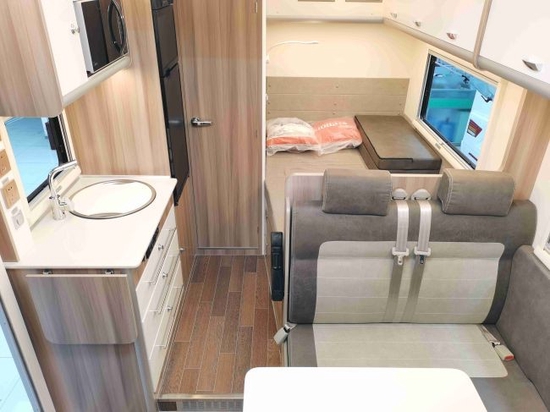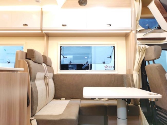 车内的布局采用后纵置床+中置客厅+卫生间+顶置吊床的基本形式,家具板材以原木风为主,起居区沿用经典的L型沙发布局,座椅全部采用磨毛工艺皮革制成。暖色的灯光一直是中天房车的一大特点,给人以十分居家,但又不浮夸的感觉,整车内部通透,温馨舒适。