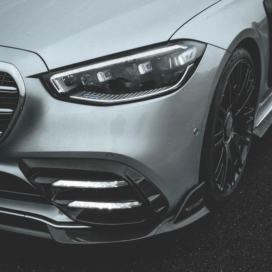 眼前这台MANSORY迈莎锐S580“银雨”车头的改变十分明显:前包围用MANSORY自家高压釜热压精炼而成的T200航空级碳纤维打造出一个宽体套件进行了拓宽处理,“碳化”后的保险杠和前唇与原厂银漆没有半点“违和”,相反使S级前脸观感更显霸气豪横!