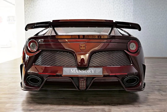 尾部变化更为明显:MANSORY为F12berlinetta重新设计了排气百叶窗和椭圆形双出排气孔,让它看起来更显“性能范儿”,同时用红线锻造碳重塑了:后保险杠、后置扩散器,尾翼等区域。。。。。。与原厂相比不仅观感倍增,碳纤维空气动力学组件“质轻于铝,坚稳胜钢”的属性还能有效减小车身自重并降低风阻,继而使得马路上的F12berlinetta更加安全节能,赛场上的绯色“跃马”难以遇见尾灯!