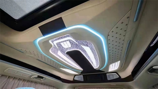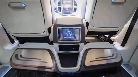 这款即是奔驰授权主机厂出品的高迪双开门威霆,整个内饰用的是浅色系的搭配,相对于原裸车,也是有了一个天翻地覆的变化。就整个内饰配置而言,大屏的导航中控;半隔断的电视机配备柏林之声的音响;靠背小桌板的日常商务办公功能;以及休息脚踏和中央扶手冰箱;在加上整车的真皮软包和窗户的窗帘;由此可看,整车的实用性,功能性以及豪华性都会有了很大程度的提升。