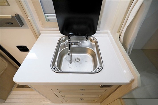 车内实木(美国红橡)搭配拉丝铝板家具+环保型房车专用柚木地板革;布局方面,采用了会客区对卡座沙发+气动升降餐桌+实木组合式橱柜+卫生间+车尾横置上下床的布局结构设计,全车的储物空间非常丰富,对于长期户外旅游者来说实用性高。暖色系氛围更贴居家效果,让成员即使在外旅行也能感受到住家的感觉。会客区真皮软包对卡座沙发满足4人乘坐,卡座沙发搭配气动升降餐桌可变为一张沙发床;固定式安全带保护行车途中乘客的人身安全。坐垫厚实,弧形靠背也提供一定的支持感,整体来说乘坐舒适感还是不错的;沙发内侧墙壁2个独立外推窗,提供采光及通风换气效果;三菱重工变频空调(单冷)制冷效果快,可手动调节温度;吊柜方便日常收纳物品。